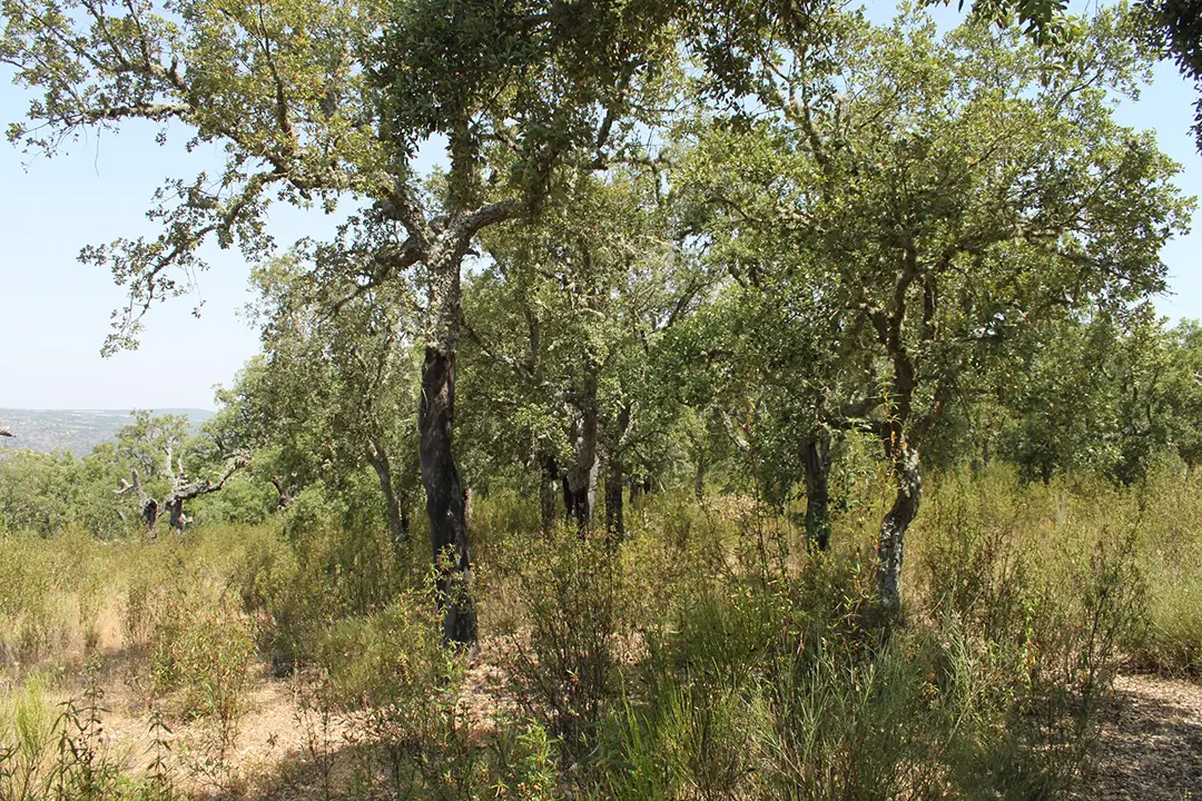 Este alcornocal es una espléndida masa de gran valor ecológico que combina ejemplares de gran porte (de hasta 10 metros de altura con copas redondeadas y densas y robustos troncos) con otros más jóvenes.