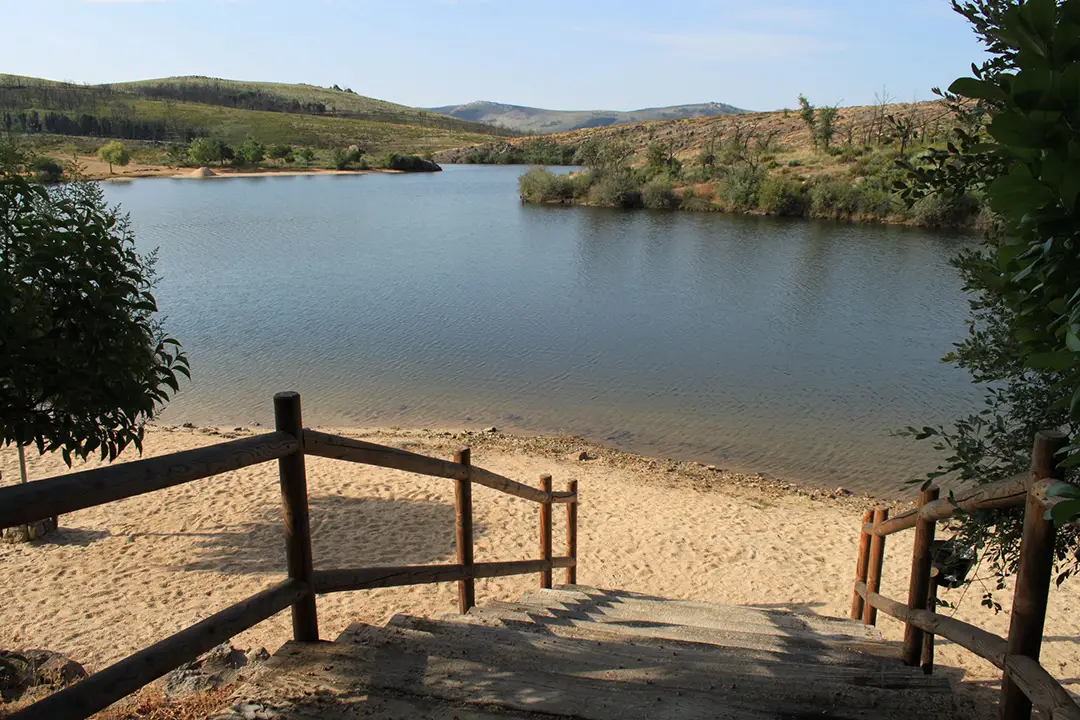 Playa situada en uno de los ramales del embalse alimentado por el río Valdalla, que ofrece aguas transparentes y cristalinas. Queda rodeada por una extensa arboleda que proporciona sombra natural, y, a diferencia de otras playas fluviales de la zona, esta cuenta con arena fina y blanquecina.